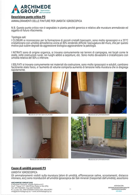 In alcuni casi è opportuno effettuare il rilievo critico, che consiste nel rimuovere pezzetti di intonaco per verificare stato, presenza e altezza dal pavimento delle guaine tagliamuro.